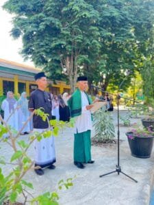 Kepala MTs Negeri 1 Alor, Abdullah Likur, M.Ag., membacakan sambutan Menteri Agama Republik Indonesia, Nasaruddin Umar, dalam upacara peringatan Hari Santri Nasional 2025 di halaman madrasah.